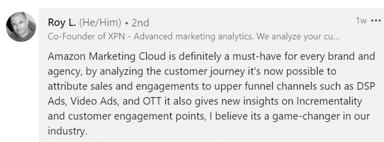 Patrick Miller describes it as a phenomenal toolโฆ โItโs awesome becauseโฆthe ability to upload brand first party data and combine that with amazon data to see what the relationships look like, such as audience overlap, cross platform media, and gain insights around what tactics and campaigns drive the businessโ (minute 8:30)