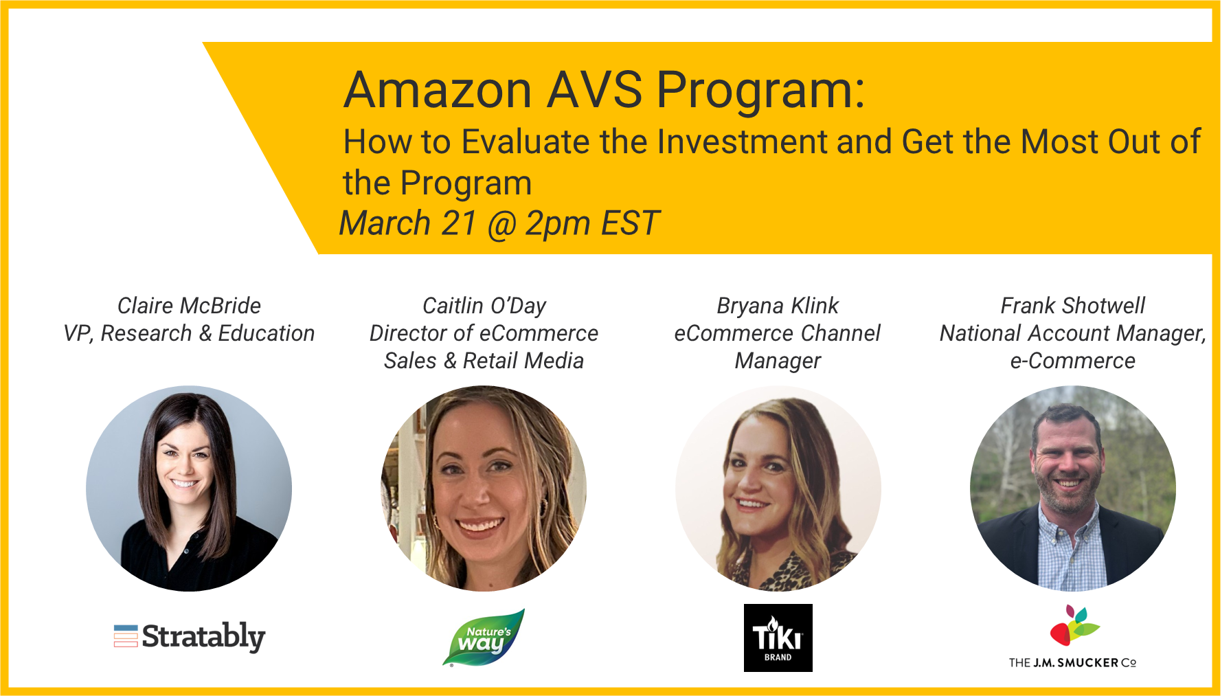 Join Claire McBride from Stratably and brand panelists Caitlin O’Day from Nature’s Way, Frank Shotwell from The J.M. Smucker Company, and Bryana Klink from TIKI Brand as they discuss key considerations and best practices on the AVS program.