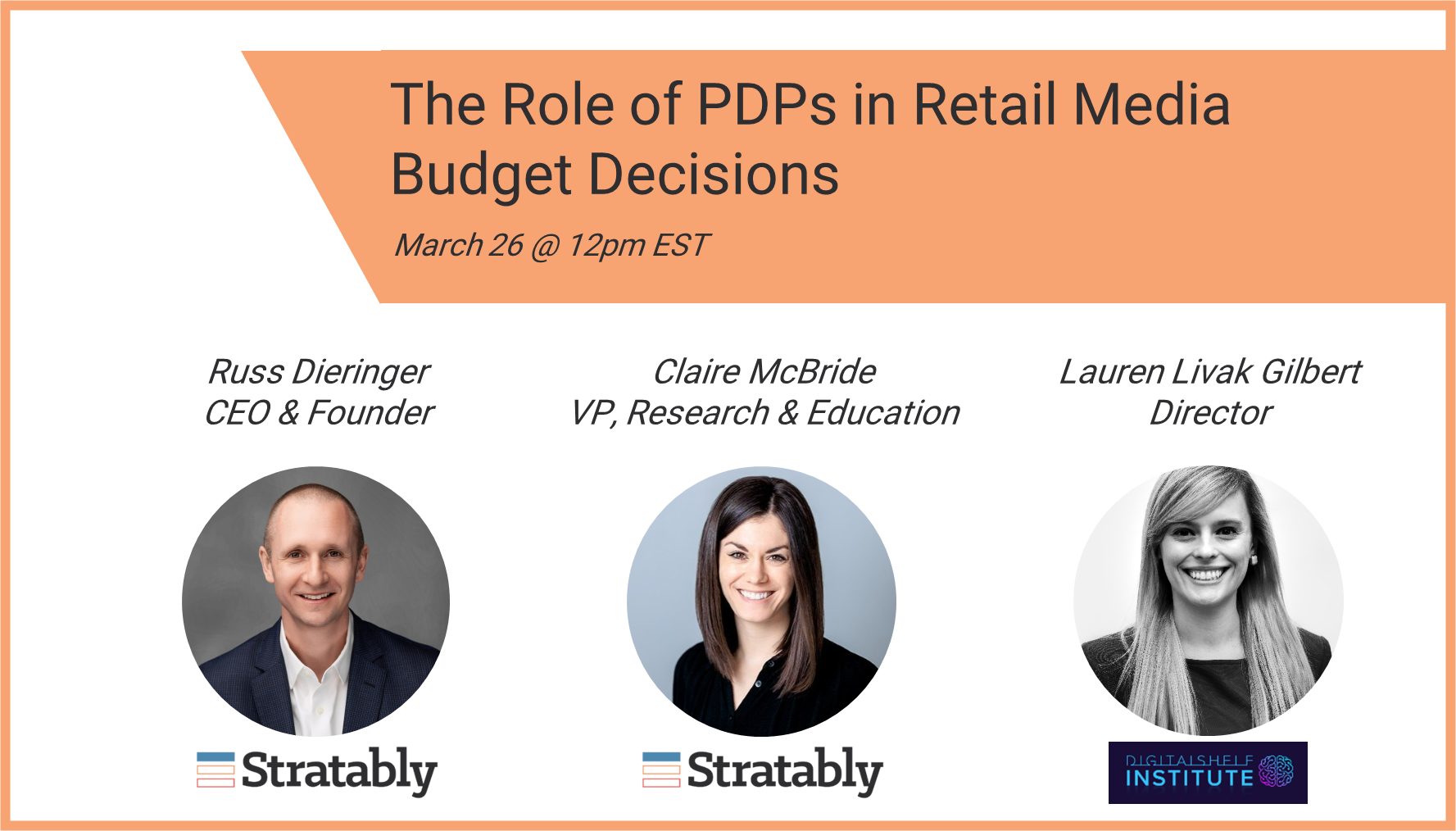 Join Lauren Livak, Director of the Digital Shelf Institute, Russ Dieringer, Founder & CEO of Stratably, and Claire McBride, VP Research & Education at Stratably to discover how brands are assessing retail media investments and what determinants go into retail media allocation.