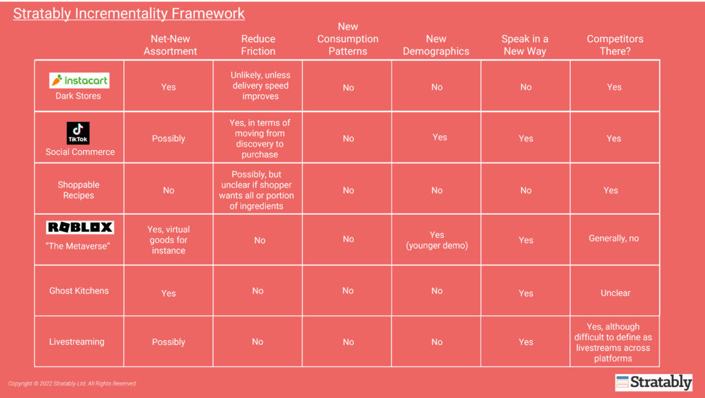 Rather than do a bunch of hand waiving when asked about incrementality, the six question framework below can be followed when a brand is evaluating new channels and trying to predict future winners.