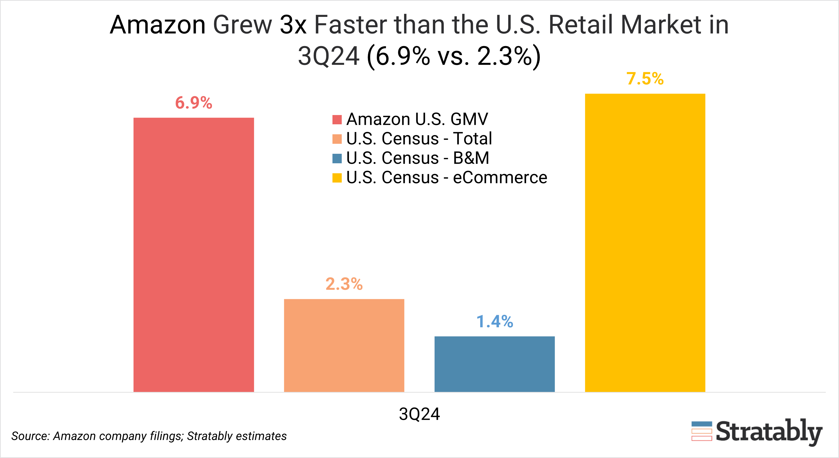 TL;DR: Amazon’s 3Q retail growth was roughly in line with 2Q, driven primarily by an accelerating 1P business and continued growth in Ads. Its retail outperformance and dominance as a full-funnel advertising platform continues to drive focus and investment among consumer brands looking for growth.